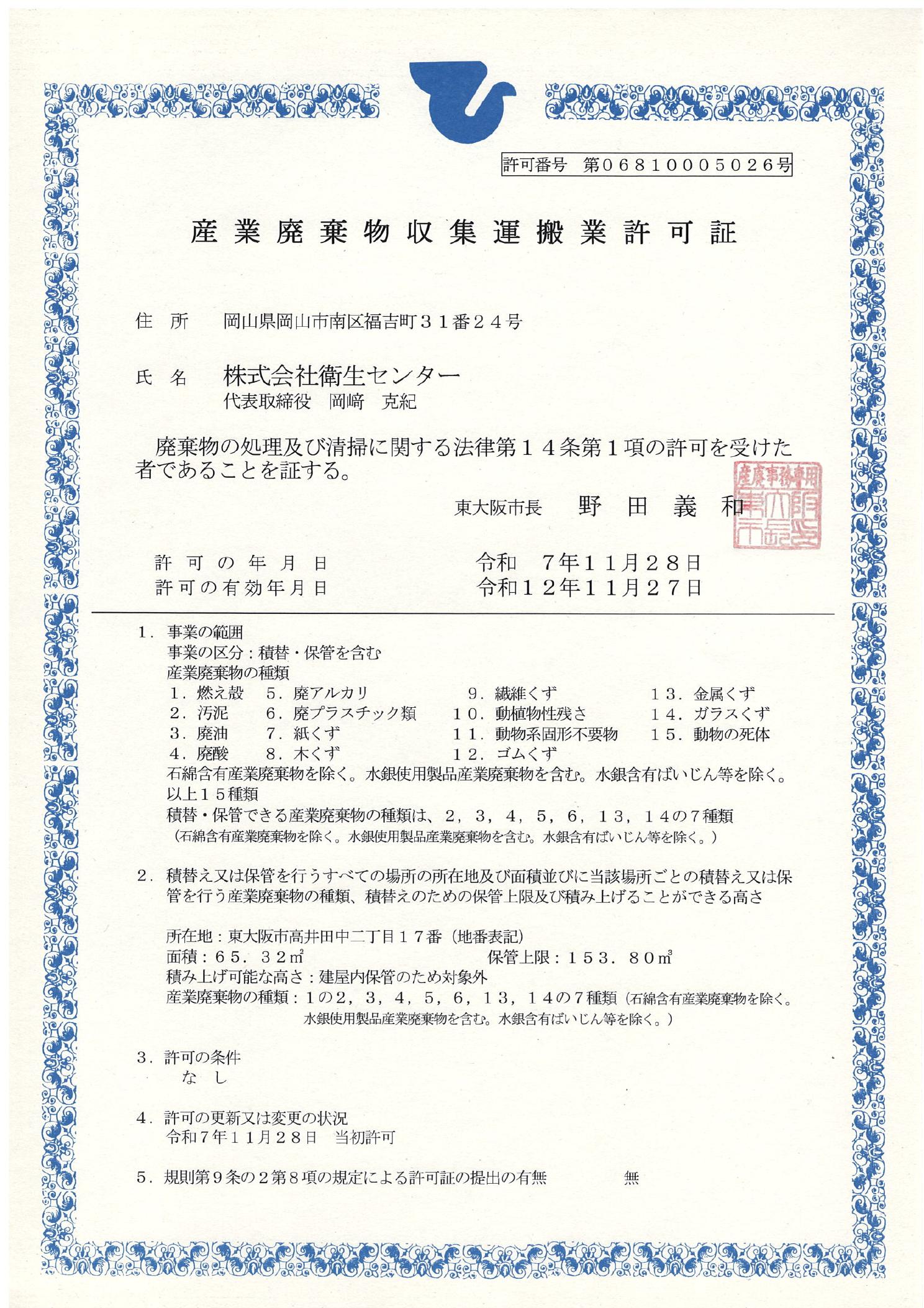 東大阪の積替え保管庫 許可取得。